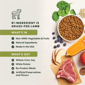 Lamb, Chicken Meal, Oatmeal, Barley, Sorghum, Brown Rice, Turkey Meal, Chicken Fat (preserved with Mixed Tocopherols), Millet, Fish Meal, Ground Flaxseed, Natural Flavor, Salt, Carrots, Montmorillonite Clay, Potassium Chloride, Apples, Blueberries, Cranberries, Vitamins (Vitamin E Supplement, Vitamin A Supplement, Niacin Supplement, Thiamine Mononitrate, d-Calcium Pantothenate, Riboflavin Supplement, Pyridoxine Hydrochloride, Vitamin B12 Supplement, Folic Acid, Vitamin D3 Supplement, Biotin), Choline Chloride, Minerals (Zinc Proteinate, Iron Proteinate, Copper Proteinate, Manganese Proteinate, Sodium Selenite, Ethylenediamine Dihydroiodide), L-Threonine, Dried Yeast, DL-Methionine, Freeze-Dried Pollock, Taurine, Pumpkin Seeds, Yeast Culture, Dried Lactobacillus acidophilus Fermentation Product, Dried Enterococcus faecium Fermentation Product, Dried Aspergillus oryzae Fermentation Extract, Dried Trichoderma longibrachiatum Fermentation Extract, Dried Bacillus subtilis Fermentation Extract, Rosemary Extract.