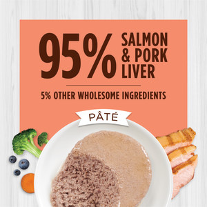 Salmon, Salmon Broth, Pork Liver, Montmorillonite Clay, Ground Flaxseed, Egg Product, Peas, Carrots, Potassium Chloride, Minerals (Iron Proteinate, Zinc Proteinate, Copper Proteinate, Manganese Proteinate, Sodium Selenite, Potassium Iodide), Choline Chloride, Salt, Sunflower Oil, Menhaden Fish Oil (preserved with Mixed Tocopherols), Vitamins (Thiamine Mononitrate, Vitamin E Supplement, Niacin Supplement, d-Calcium Pantothenate, Pyridoxine Hydrochloride, Riboflavin Supplement, Vitamin A Supplement, Biotin, Vitamin D3 Supplement, Vitamin B12 Supplement, Folic Acid), Taurine, Magnesium Sulfate, L-Ascorbyl-2-Polyphosphate, Artichokes, Cranberries, Pumpkin, Tomato, Blueberries, Broccoli, Cabbage, Kale, Parsley.