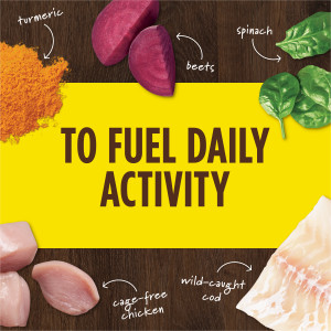 Chicken, Pumpkinseeds, Cod, Beef Liver, Beets, Apples, Spinach, Blueberries, Cherries, Vinegar, Potassium Chloride, Fish Oil, Cod Liver Oil, Salt, Turmeric, Yeast Culture, Minerals (Zinc Proteinate, Copper Proteinate, Manganese Proteinate, Calcium Iodate), Ascorbic Acid, Vitamin E Supplement, Mixed Tocopherols (for freshness), Rosemary Extract.