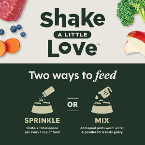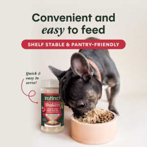 Add Instinct Raw Boost Shakers to your dog’s current food using the information below. Remember to reduce the calorie amount of your current food accordingly to avoid overfeeding. Sprinkle - Shake 2 tablespoons of powder for every 1 cup of your dog's food Mix - Add equal parts warm water and powder for a tasty gravy This product is intended for intermittent or supplemental feeding only. Use as part of your dog's healthy feeding plan. As with all food products, care should be taken in storing and handling. Wash your hands and bowls before and after serving. Keep package sealed to maintain freshness. Store in a cool, dry place.