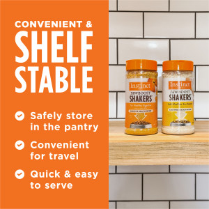 Add Instinct Raw Boost Shakers to your cat’s current food using the information below. Remember to reduce the calorie amount of your current food accordingly to avoid overfeeding. Sprinkle - Shake 1/2 tablespoon of powder for every 1/4 cup of your cat's food Mix - Add equal parts warm water and powder for a tasty gravy This product is intended for intermittent or supplemental feeding only. Use as part of your cat's healthy feeding plan. As with all food products, care should be taken in storing and handling. Wash your hands and bowls before and after serving. Keep package sealed to maintain freshness. Store in a cool, dry place.
