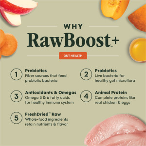 Chicken, Chicken Meal, Brown Rice, Barley, Fish Meal, Chicken Fat (Preserved with Mixed Tocopherols), Oatmeal, Freeze-Dried Chicken, Natural Flavor, Sweet Potato, Ground Flaxseeds, Freeze-Dried Chicken Liver, Dried Yeast, Carrots, Pumpkin Seeds, Salt, Freeze-Dried Chicken Heart, Dried Egg, Dried Tomato Pomace, Potassium Chloride, Vitamins (Vitamin E Supplement, Vitamin A Supplement, Niacin Supplement, Thiamine Mononitrate, d-Calcium Pantothenate, Riboflavin Supplement, Pyridoxine Hydrochloride, Vitamin B12 Supplement, Folic Acid, Vitamin D3 Supplement, Biotin), Apples, Blueberries, Cranberries, Pumpkin, Citrus Pulp, Dried Beet Pulp, Minerals (Zinc Proteinate, Iron Proteinate, Copper Proteinate, Manganese Proteinate, Sodium Selenite, Ethylenediamine Dihydroiodide), Dried Ginger, Dried Chicory Root, L-Ascorbyl-2-Polyphosphate, Choline Chloride, Annatto Extract, Taurine, Yucca Schidigera Extract, Yeast Culture, Salmon Oil, Apple Cider Vinegar, Dried Lactobacillus acidophilus Fermentation Product, Dried Enterococcus faecium Fermentation Product, Dried Aspergillus oryzae Fermentation Extract, Dried Trichoderma longibrachiatum Fermentation Extract, Dried Bacillus subtilis Fermentation Extract, Dried Bacillus coagulans Fermentation Product, Rosemary Extract.