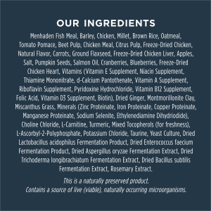 Menhaden Meal, Barley, Chicken, Millet, Brown Rice, Oatmeal, Tomato Pomace, Beet Pulp, Chicken Meal, Citrus Pulp, Freeze-Dried Chicken, Natural Flavor, Carrots, Ground Flaxseed, Freeze-Dried Chicken Liver, Apples, Salt, Pumpkin Seeds, Salmon Oil, Cranberries, Blueberries, Freeze-Dried Chicken Heart, Vitamins (Vitamin E Supplement, Niacin Supplement, Thiamine Mononitrate, d-Calcium Pantothenate, Vitamin A Supplement, Riboflavin Supplement, Pyridoxine Hydrochloride, Vitamin B12 Supplement, Folic Acid, Vitamin D3 Supplement, Biotin), Dried Ginger, Montmorillonite Clay, Miscanthus Grass, Minerals (Zinc Proteinate, Iron Proteinate, Copper Proteinate, Manganese Proteinate, Sodium Selenite, Ethylenediamine Dihydriodide), Choline Chloride, L-Carnitine, Turmeric, Mixed Tocopherols (for freshness), L-Ascorbyl-2-Polyphosphate, Potassium Chloride, Taurine, Yeast Culture, Dried Lactobacillus acidophilus Fermentation Product, Dried Enterococcus faecium Fermentation Product, Dried Aspergillus oryzae Fermentation Extract, Dried Trichoderma longibrachiatum Fermentation Extract, Dried Bacillus subtilis Fermentation Extract, Rosemary Extract.