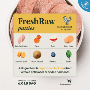 Chicken (including Ground Chicken Bone), Chicken Liver, Chicken Heart, Carrots, Apples, Sweet Potatoes, Butternut Squash, Ground Miscanthus Grass, Montmorillonite Clay, Ground Flaxseed, Salmon Oil, Vitamins (Vitamin E Supplement, Thiamine Mononitrate, Vitamin D3 Supplement), Potassium Chloride, Tricalcium Phosphate, Salt, Choline Chloride, Minerals (Zinc Proteinate, Copper Proteinate, Manganese Proteinate, Calcium Iodate), DL-Methionine, Blueberries, Spinach.