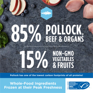 Pollock, Beef Kidney, Beef Spleen, Beef Liver, Beef Heart, Beef, Carrots, Apples, Butternut Squash, Pumpkinseeds, Ground Miscanthus Grass, Montmorillonite Clay, Salmon Oil, Tricalcium Phosphate, Vitamins (Vitamin E Supplement, Thiamine Mononitrate, Vitamin D3 Supplement), Salt, Potassium Chloride, Mixed Tocopherols (for freshness), Minerals (Zinc Proteinate, Copper Proteinate, Manganese Proteinate, Calcium Iodate), Blueberries, Spinach, Rosemary Extract.