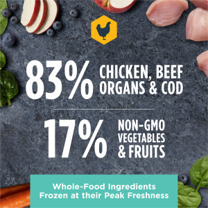 Chicken (including Ground Chicken Bone), Beef Liver, Beef Spleen, Beef Kidney, Cod, Carrots, Apples, Sweet Potatoes, Butternut Squash, Montmorillonite Clay, Ground Miscanthus Grass, Ground Flaxseed, Salmon Oil, Pumpkinseeds, Chicory Root, Tricalcium Phosphate, Salt, Vitamins (Vitamin E Supplement, Thiamine Mononitrate, Vitamin D3 Supplement), Potassium Chloride, Minerals (Zinc Proteinate, Copper Proteinate, Manganese Proteinate, Calcium Iodate), Blueberries, Spinach.
