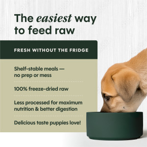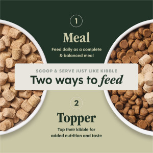 Keep freeze-dried raw on your pantry shelf for an easy-to-serve raw meal—just scoop and serve like kibble or add water for extra moisture