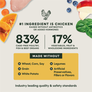 Chicken, Beef Liver, Beef Spleen, Beef Kidney, Cod, Pumpkin Seeds, Carrots, Apples, Sweet Potatoes, Butternut Squash, Montmorillonite Clay, Ground Miscanthus Grass, Ground Flaxseed, Salmon Oil, Chicory Root, Tricalcium Phosphate, Salt, Vitamins (Vitamin E Supplement, Thiamine Mononitrate, Vitamin D3 Supplement), Potassium Chloride, Minerals (Zinc Proteinate, Copper Proteinate, Manganese Proteinate, Calcium Iodate), Mixed Tocopherols (for freshness), Blueberries, Spinach, Rosemary Extract.
